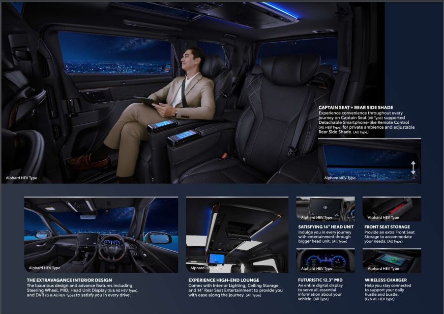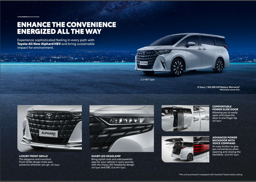 Toyota Alphard bukan sekadar kendaraan mewah biasa; mobil ini punya keseimbangan sempurna antara prestise dan kenyamanan. Bayangkan mengemudi di tengah kemacetan kota dengan tampilan elegan Alphard yang membuat mata orang-orang berpaling, sambil menikmati interior yang begitu nyaman sehingga perjalanan panjang terasa seperti santai di sofa kesayangan. Dari kenyamanan luar biasa hingga fitur-fitur canggih yang menyenangkan, Toyota Alphard punya semua yang AutoFamily butuhkan saat berkendara di jalanan. Untuk mengenal spesifikasinya lebih lanjut, pastikan AutoFamily menyimak review Toyota Alphard yang akan dijelaskan di bawah ini! Kenyamanan Tiada Duanya Kenyamanan menjadi salah satu poin penting yang membuat Toyota Alphard mobil pilihan unggul yang baik digunakan untuk perjalanan jarak dekat maupun jauh. Mulai dari sistem suspensi yang canggih hingga desain interior yang luas dan ergonomis, Alphard menawarkan kenyamanan tiada duanya bagi pengguna. Sistem suspensi Alphard mampu menyerap guncangan jalan dengan baik sehingga pengguna tidak merasakan guncangan yang mengganggu, bahkan saat melewati jalan berlubang atau berbatu. Hal ini membuat perjalanan jarak jauh terasa lebih nyaman dan mengurangi rasa lelah bagi pengemudi maupun penumpang. Selain itu desain interior Alphard yang luas memberikan ruang gerak optimal bagi penumpang. Kursi yang menggunakan bahan berkualitas tinggi dan penyesuai posisi memungkinkan pengguna untuk menemukan posisi duduk yang paling nyaman. Toyota Alphard bahkan menawarkan pengalaman berkendara seperti sedang bersantai di High-End Lounge dengan segala fitur yang ada di dalamnya. Semua pengaturan untuk membuat perjalanan lebih nyaman, bisa langsung Anda akses dari tempat duduk. Kemewahan dalam Setiap Perjalanan Kemewahan Toyota Alphard dapat dirasakan dalam setiap perjalanan sehingga sangat tepat untuk Anda yang mengutamakan gaya hidup mewah. Mulai dari desain eksterior yang elegan hingga interior yang dilengkapi dengan fitur-fitur mewah, Alphard memberikan pengalaman berkendara yang istimewa. Desain eksterior Alphard mencerminkan kemewahan dan keanggunan dengan garis-garis yang tegas, seperti lampu LED yang modern dan grille berbingkai chrome. Setiap detail eksterior Alphard dirancang untuk menarik perhatian dan mencerminkan kesan prestisius. Di dalam, kemewahan Alphard tidak kalah mencolok. Interior yang dilapisi dengan bahan berkualitas tinggi, aksen kayu, dan sentuhan chrome menambahkan nuansa mewah yang elegan. Keberadaan sistem audio bahkan ikut menghadirkan pengalaman berkendara yang tak terlupakan. Keunggulan Lainnya yang Dimiliki Toyota Alphard Berikut berbagai macam keunggulan yang membuat Toyota Alphard menjadi pilihan unggul dalam kategori mobil mewah dan nyaman. Toyota Alphard menampilkan desain eksterior yang mewah dengan garis-garis yang tegas dan detail-detail premium seperti lampu LED modern serta grille berbingkai chrome. Setiap elemen desain eksterior Alphard dipikirkan secara teliti untuk menciptakan kesan prestisius tetapi tetap andal saat digunakan di jalan raya. 2. Kenyamanan Interior yang Luar Biasa Interior Alphard menawarkan kenyamanan luar biasa dengan kursi yang dilapisi bahan berkualitas tinggi, fitur-fitur penyesuai posisi, dan ruang kabin yang luas. Aksen kayu dan sentuhan krom juga menambahkan nuansa mewah yang elegan di dalam ruang kabin Alphard sehingga tercipta lingkungan yang nyaman bagi pengguna. 3. Konektivitas di Setiap Perjalanan Alphard dilengkapi dengan berbagai fitur konektivitas modern seperti layar sentuh responsif, sistem entertainment yang intuitif, dan koneksi Bluetooth untuk memudahkan pengguna terhubung dengan berbagai aplikasi dan layanan online. Semua fitur tersebut menjadikan setiap perjalanan anda makin terkoneksi dan menyenangkan. Fitur-fitur lengkap seperti navigasi GPS, kamera belakang, sensor parkir, smart key, dan Start & Stop Button, hadir untuk memudahkan pengemudi dalam manuver, parkir, sekaligus penggunaan kendaraan secara keseluruhan. Alphard jelas dirancang untuk memberikan pengalaman berkendara yang praktis dan mudah bagi penggunanya. Sistem audio premium dan layar hiburan di bagian belakang kursi Alphard memberikan hiburan berkualitas tinggi bagi pengguna maupun penumpangnya. Fitur-fitur ini dirancang untuk membuat perjalanan lebih menyenangkan sehingga Anda tak perlu khawatir merasa bosan. Dimensi ukuran Alphard jelas megah. Hal ini terbukti dari panjangnya sebesar 5,010 mm, lebarnya 1,850 mm, dan tingginya 1,945 mm. Ukurannya yang besar membuat Toyota Alphard mampu menampung hingga 7 orang sekaligus dalam waktu yang bersamaan. Kapasitas bagasinya sendiri mampu menampung 2 sampai 3 koper. Melakukan perjalanan jauh bersama Alphard jelas bukan hal mustahil. Toyota Alphard juga dilengkapi dengan fitur keselamatan canggih seperti Lane Departure Alert, Dynamic Radar Cruise Control, Lane Tracing Assist, Adaptive High Beam, Pre-Collision System, dan Drive Monitoring System. Belum lagi tersedia juga Panoramic View Monitor yang akan memudahkan Anda dalam mengendalikan keadaan di sekitar mobil dengan baik. Jika belum cukup, Toyota Alphard juga sudah memiliki sistem perlindungan lengkap dan berkualitas, yakni Toyota Safety Sense 0.3 yang akan menjaga Anda di setiap perjalanan. Berkendara menggunakan Toyota Alphard akan mengubah perjalanan Anda yang membosankan menjadi menyenangkan dan nyaman. Seluruh fitur canggih yang ada di dalamnya akan memastikan Anda memiliki pengalaman berkendara terbaik sepanjang masa. Dapatkan Toyota Alphard untuk menemani perjalanan Anda hanya di Auto2000 Digiroom!1. Eksterior yang Mewah dan Elegan